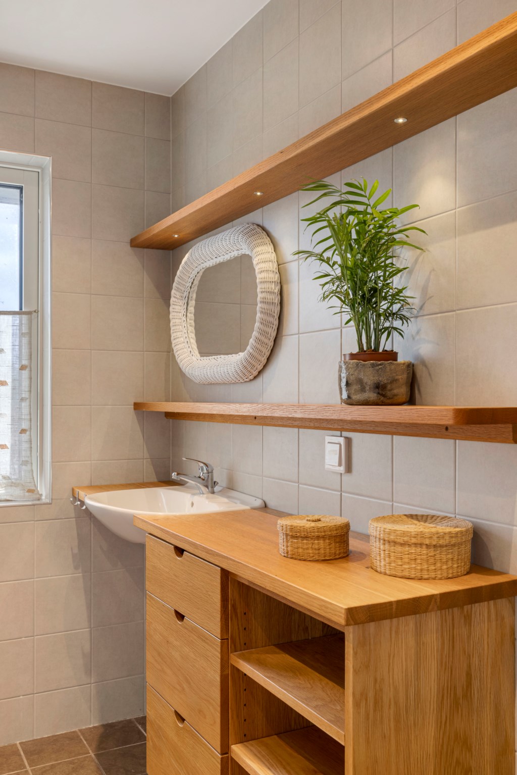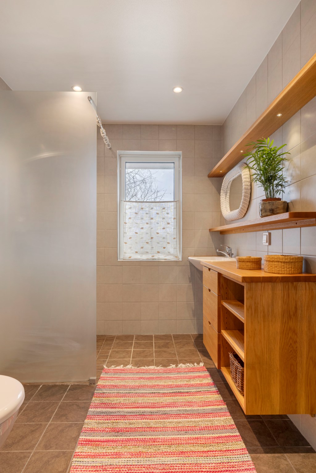 Golv: klinker. Väggar: kakel. Utrustning: WC, tvättställ, dusch och handdukstork. Elektrisk golvvärme