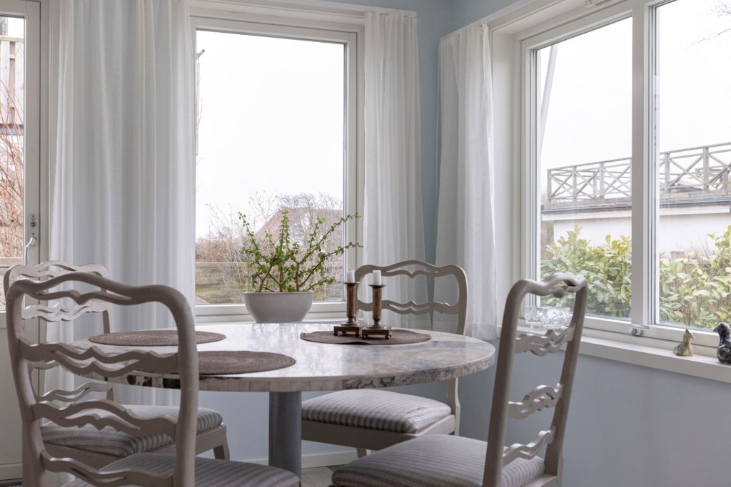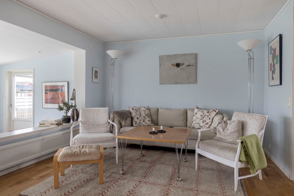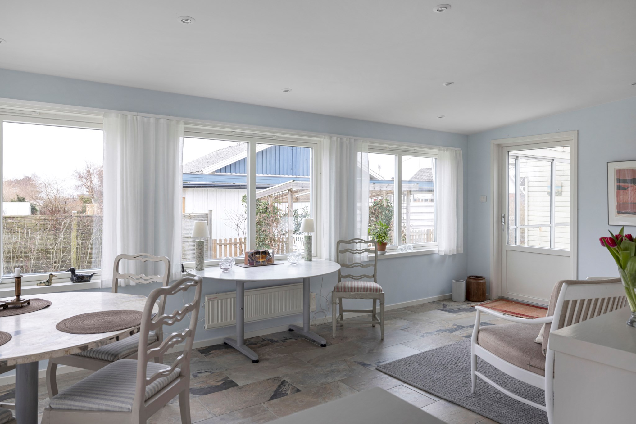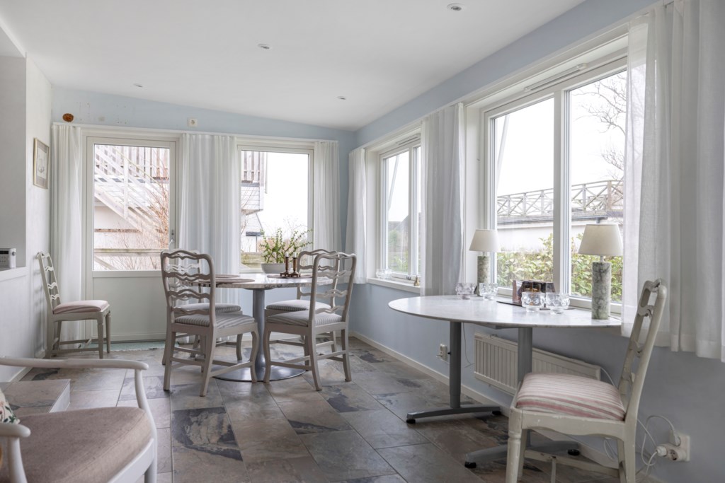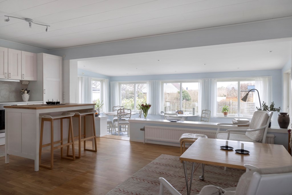 Loungen präglas av stora fönsterpartier som släpper in rikligt med dagsljus och erbjuder utgång både till trädgården och till det inglasade uterummet, vilket ger ett naturligt samband mellan inne- och utemiljö.