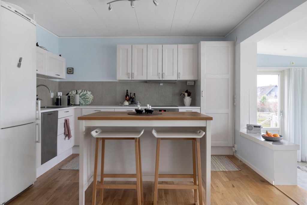 Stilrent kök i vinkel med öppen planlösning mot matplats och vardagsrum. Utrustning: spishäll, ugn, kyl/frys och diskmaskin.