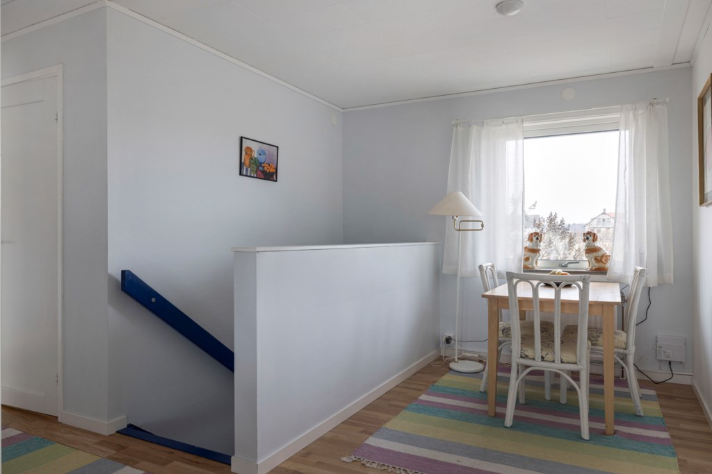 Hallens ljusa och luftiga karaktär skapar ett välkomnande första intryck med praktiska avhängningsmöjligheter. Härifrån öppnar bostaden upp sig mot köket, som utgör en naturlig samlingspunkt med köksö och goda arbetsytor. Den öppna planlösningen ger fina siktlinjer och ett behagligt flöde mellan rummen och leder vidare via en halvtrappa ner till den inbjudande loungedelen.