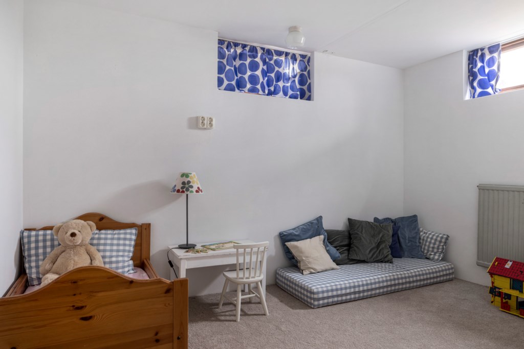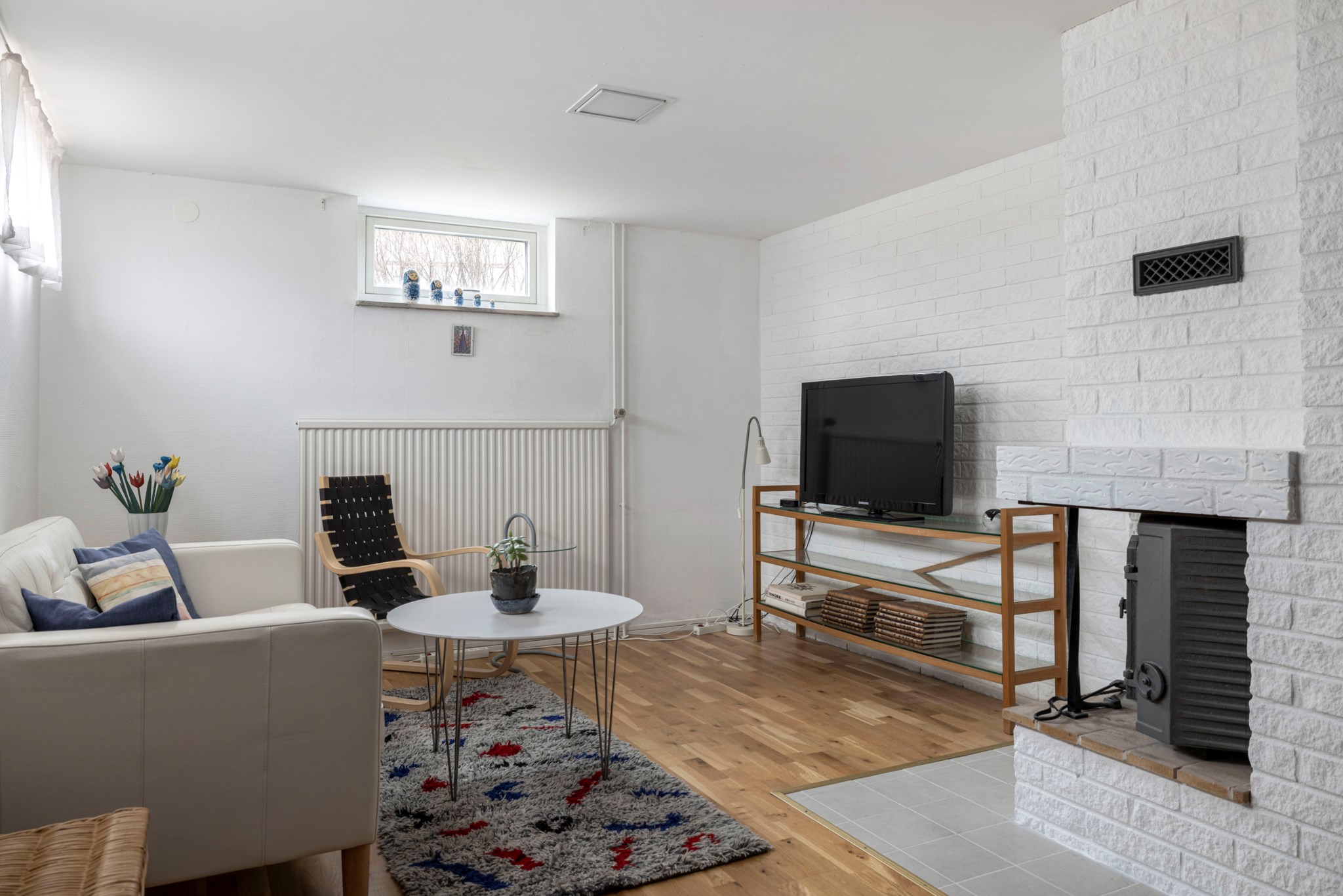 Via bostadens centralt placerade trappa nås källarplanet där ett allrum lämpar sig väl som TV- eller lekrum och kompletteras av en öppen spis som bidrar till en ombonad känsla. Här finns även två väl tilltagna sovrum, varav ett med direkt utgång, samt ett nybyggt badrum. Källaren erbjuder dessutom ett funktionellt tvätt- och förrådsrum utrustat med tvättmaskin.Kök
